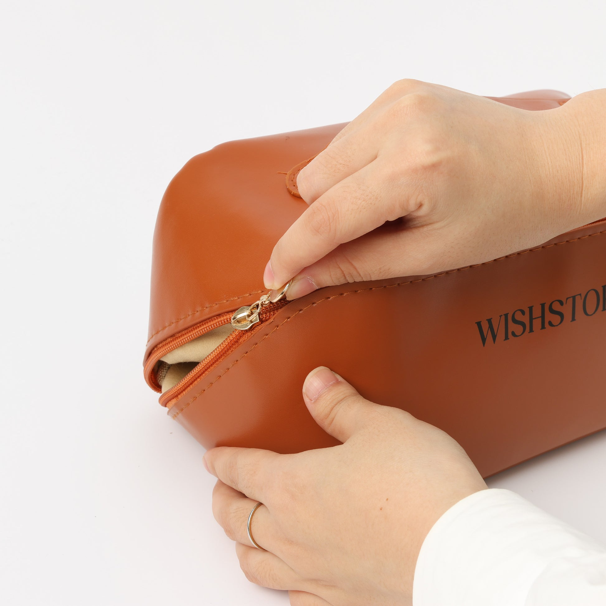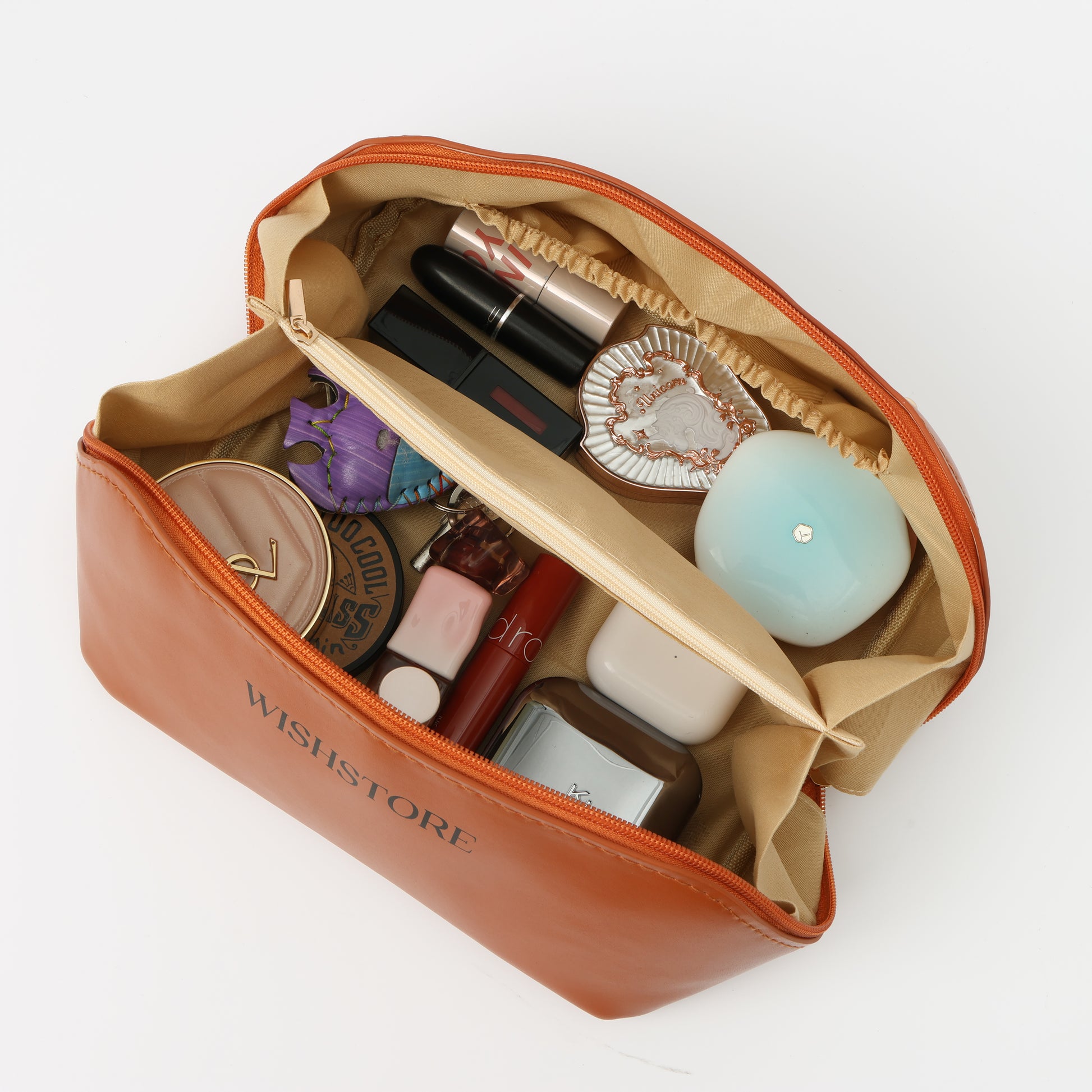 Large Capacity Design: Measuring 9.050 x 4.9x 4.5nches, this makeup bag offers ample space for your cosmetics and toiletries, made from high-quality PU material for a soft, lightweight, and durable feel. Easier Access: The flat design allows the bag to open wide, giving you a full view of all your makeup. It closes easily and quickly when you're ready to go. Details: Features a custom metal zipper for smooth closure and neat alignment. The interior includes separate inner pockets for organized storage. Multifunctional Use: Ideal for travelers, this makeup bag can also serve as a toiletry bag, purse, or bathroom bag. Perfect for business trips, vacations, and outdoor activities.